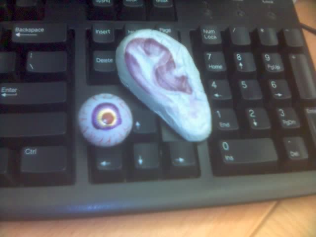 "Eyeball" & "ear lobe" chocs...Dat's wat greeted me wen I reached é ofc diz am... É Chief Supervisor came early & plced 'em strange-human-organ-chocs on evry1's keypad..! & her greetin' of é day was "Happy Hallowe'en..!" On another note, NO MEETIN' durin' a festive season xpecially on a Mon coz diz itchy mouth of mine spout nothin' but nonsense... & é playful eyes kept shuttin'..! P/S : 2 é Corp, 10 q very much 4 dat complimentary festive goodies..! & yeay, it's a ½-day on Wed!!!